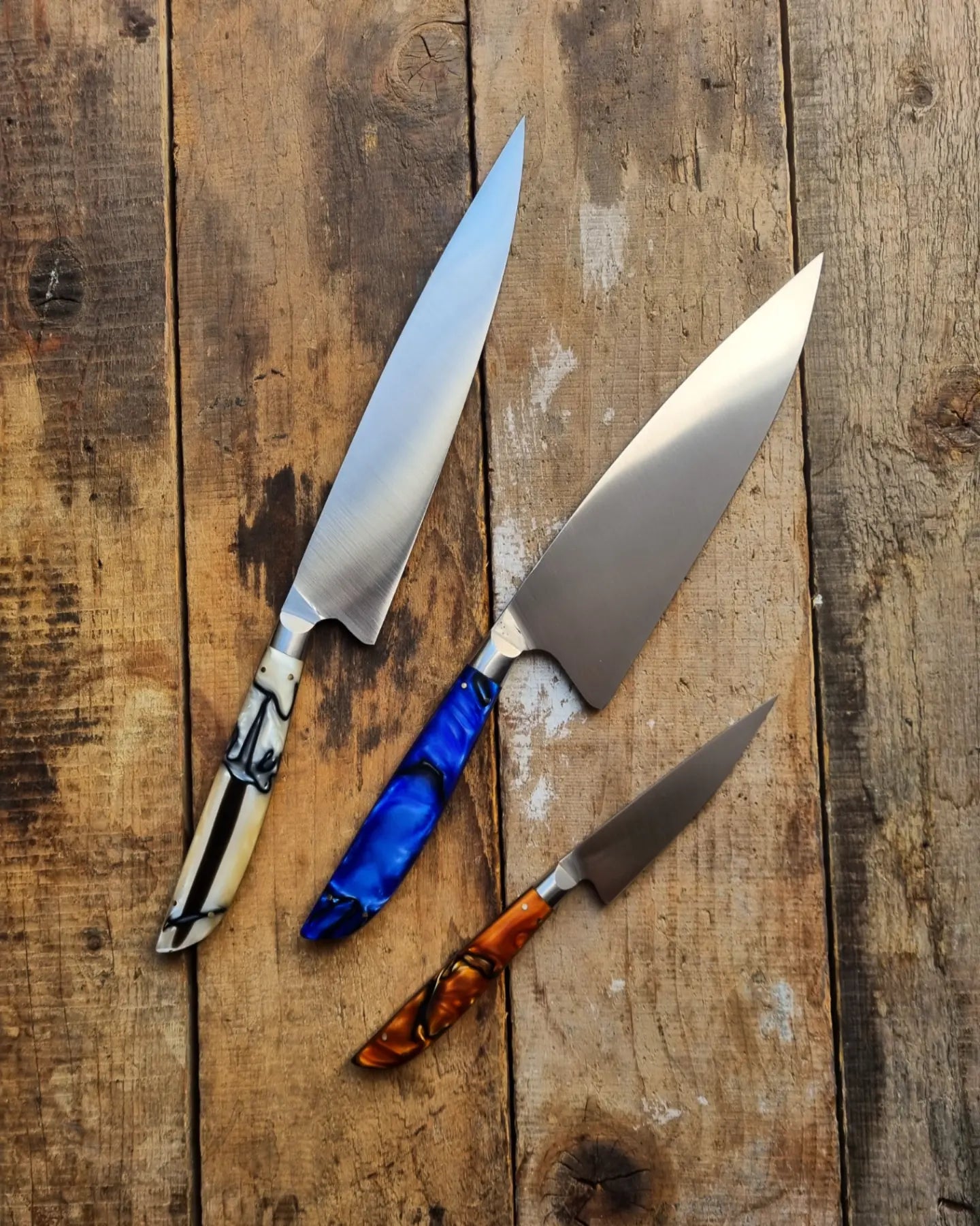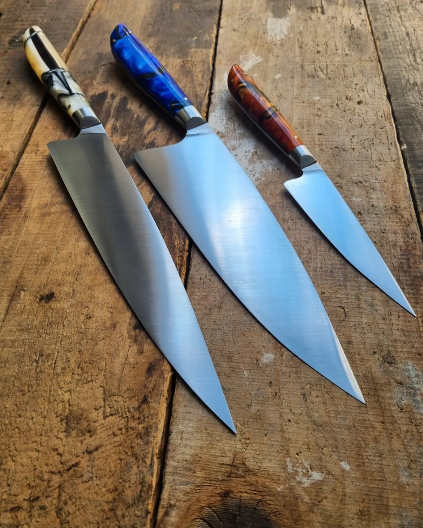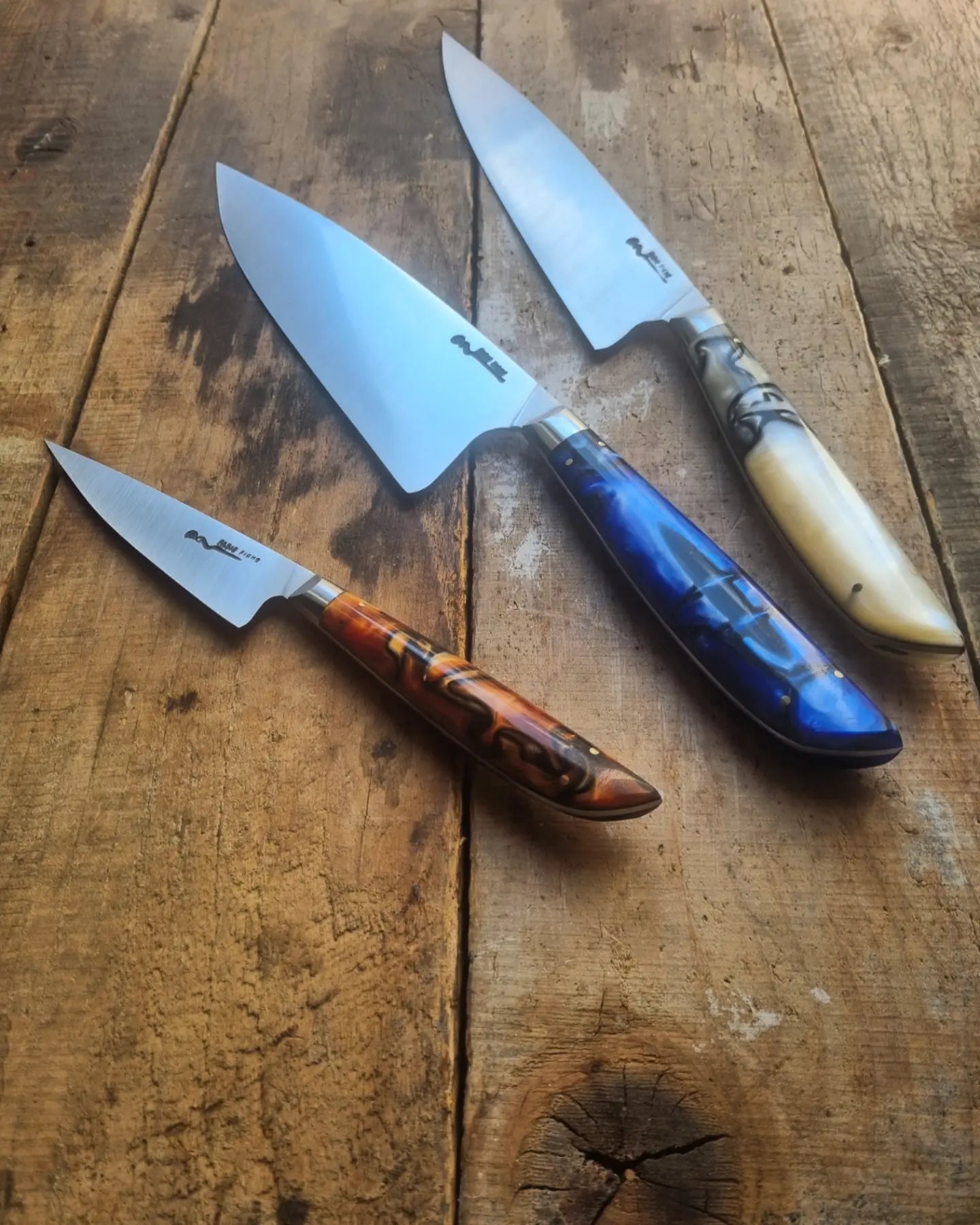 Manici con bolster in acciaio inox, full tang e resine colorate.